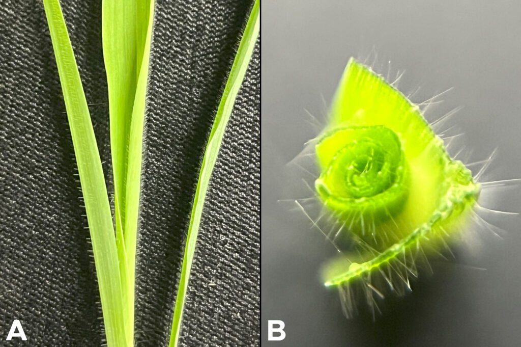 Photo 2. Crabgrass leaves, like the large crabgrass pictured here, are rolled in the sheath and appear to unfurl like a piece of rolled up paper as they expand (A). A cross-section of the sheath shows leaves swirled in the bud (B) as opposed to folded as seen in some other grasses. Photo by Erin Hill, MSU.