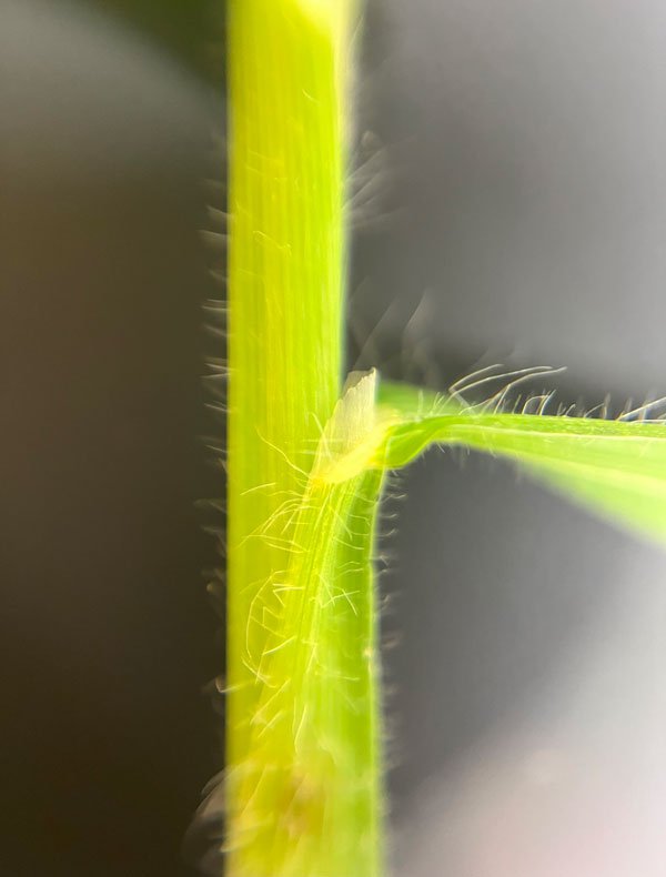 Photo 3. At the base of the crabgrass leaf where it meets the sheath is a translucent, membranous structure called a ligule. Photo by Erin Hill, MSU.