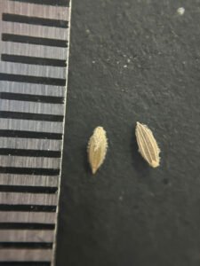 Photo 5. Large crabgrass seeds; tick marks are spaced at 1 mm. Photo by Erin Hill, MSU.
