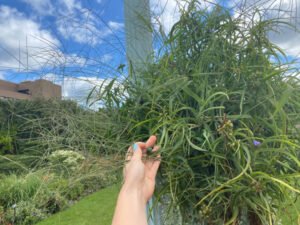 Photo 6. Crabgrass growing undetected in a hanging basket can be a source of seeds entering the surrounding turf grass and landscape. Photo by Erin Hill, MSU.
